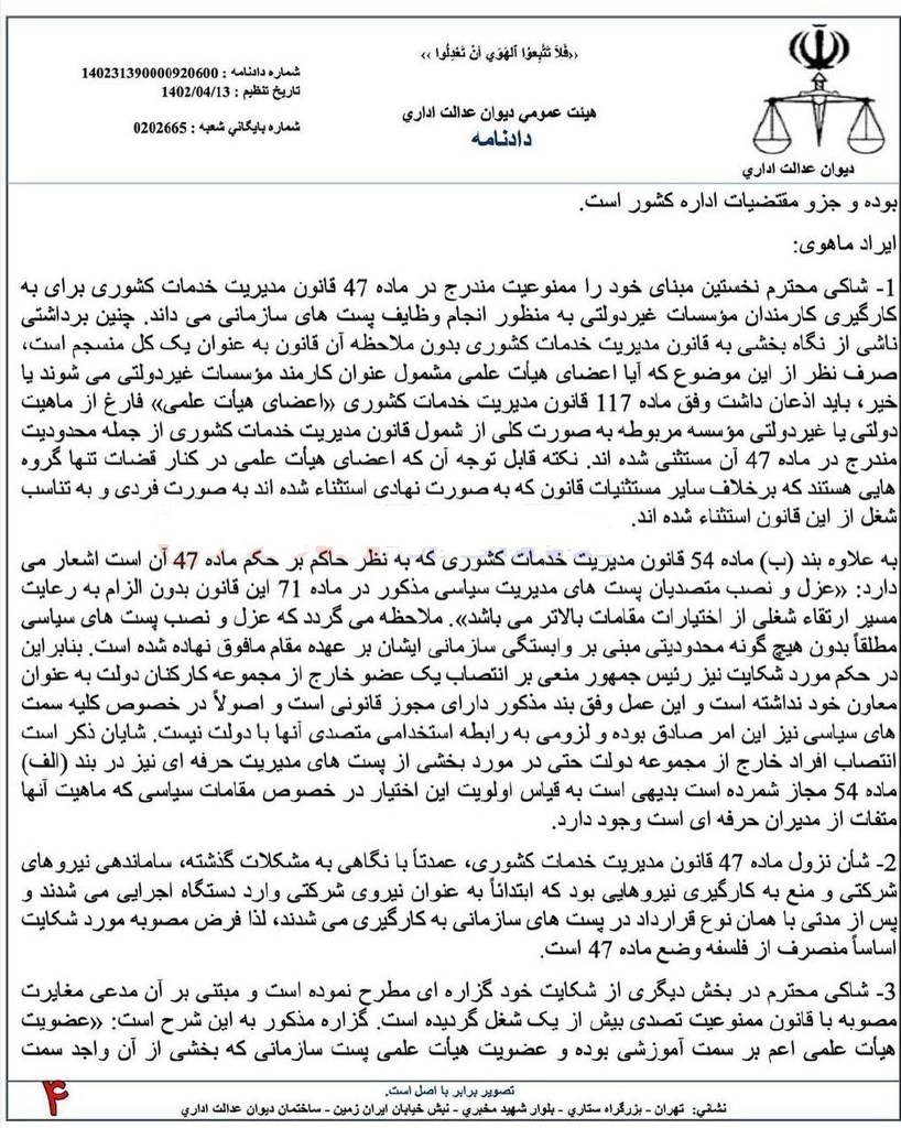 طبق اعلام این رأی که به امضای حجتالاسلام مظفری؛ رییس دیوان عدالت اداری رسیده است، انتصاب میثم لطیفی به ریاست سازمان اداری و استخدامی کشور به دلیل عضویت وی در دانشگاه امام صادق (ع) به عنوان یک نهاد غیردولتی و غیرانتفاعی، غیرقانونی است و از این رو حکم انتصاب وی که از سوی سید ابراهیم رئیسی، رییس جمهور کشورمان در شهریورماه سال ۱۴۰۰ صادر شده بود، ابطال میشود.