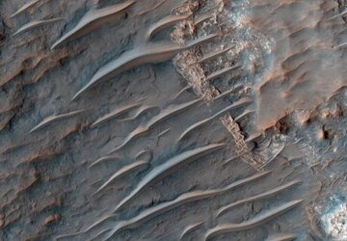 جی پلاس، دیجیاتو نوشت: در نمایی از مریخ، تپههای شنی قهوهای مایل به قرمز را مشاهده میکنید که نمونهای از برآمدگیهای عرضی را در تپههای شنی Utopia Planitia مریخ نشان میدهد.