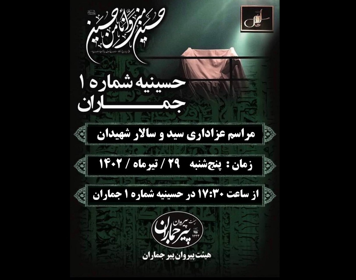 احتراما به اطلاع سرور عزیز و بزرگوار می رساند مراسم عزاداری سید و سالار شهیدان در حسینیه شماره۱ جماران برگزار می شود.