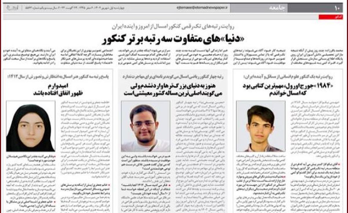 به گزارش جماران؛ روزنامه اعتماد با سه رتبه برتر کنکور درباره امروز و آینده ایران گفتوگو کرده است.