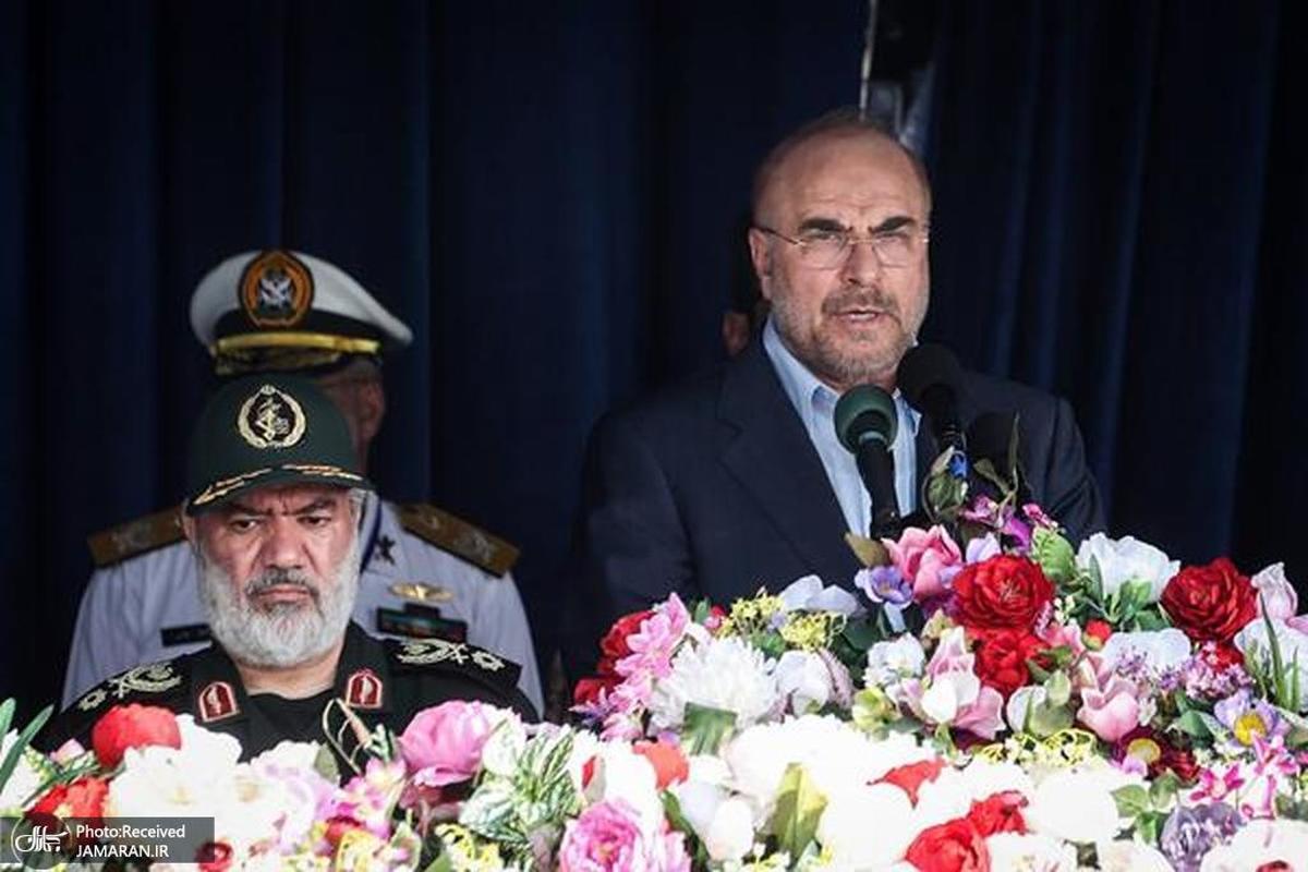 محمد باقر قالیباف رئیس مجلس شورای اسلامی در مراسم رژه نیروهای مسلح در بندرعباس تاکید کرد: مجددا تأکید میکنم که ما اینجا در کنار همسایگان و در این منطقه اسلامی تأکید داریم که خوشبختی مردم خود را در قطع اعتماد و اتکا به چشم و دست بیگانه و تکیه بر اراده ملی و مردمی میبینیم و تقویت رابطه با همه کشورهای اسلامی اولویت قطعی سیاست خارجی جمهوری اسلامی ایران است که امروز نیز شاهد این همکاری و هماهنگی میان کشورهای اسلامی به ویژه در منطقه خلیج فارس هستیم که امیدوارم این همدلی و همراهی در صلح پایدار و رشد و توسعه منطقه به سرانجام و نتیجه نهایی برسد.