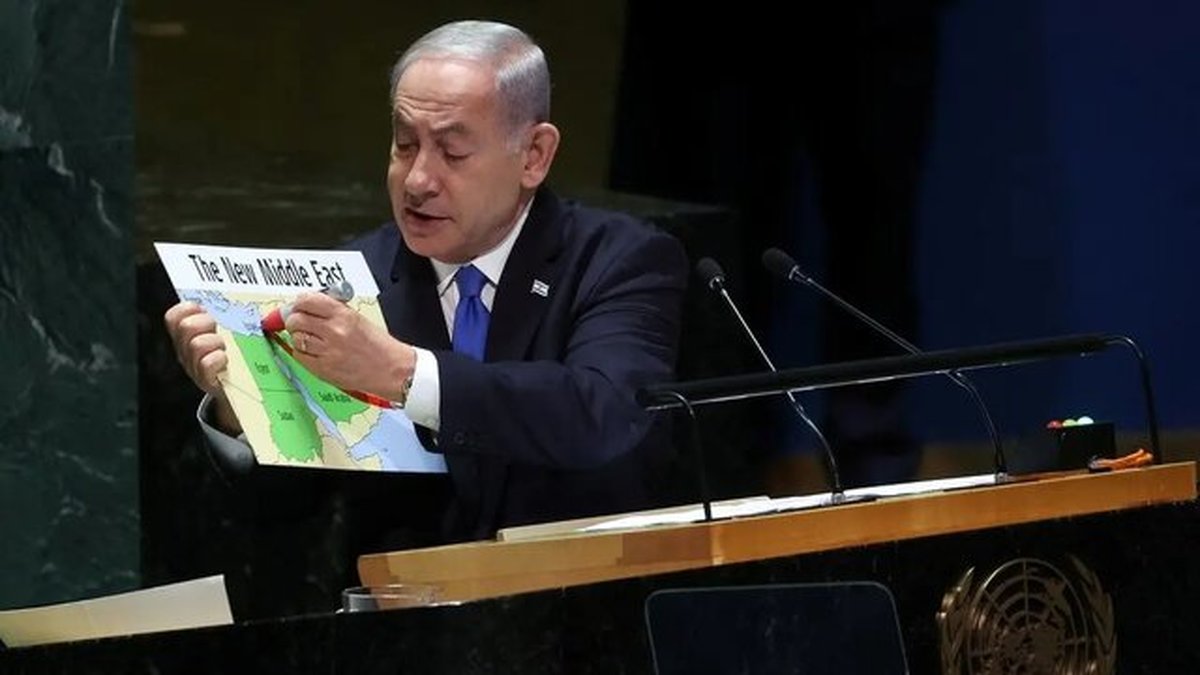 نتانیاهو طی سخنرانی خود همچنین با به نمایش گذاشتن نقشهای مدعی شد که صلح با عربستان سعودی باعث ایجاد "خاورمیانهای جدید" خواهد شد.