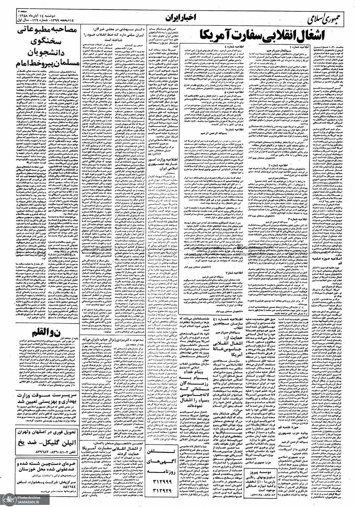 ملت ایران پس از تحمل سالیان دراز سلطه امپریالیستی آمریکا اکنون با واقعیت دیگری از همانسان روبهرو میشود و آن مسئله جاسوسی بر علیه، انقلاب ایران است. سفارت آمریکا در ایران طبق شواهد زیاد و ارتباطات مکشوفه لانه جاسوسی و توطئه بر علیه انقلاب ما بود و ملت مسلمان ما نمیپذیرفت که این روند کار ادامه یابد. بنابراین تصمیم به تعطیلی این کانون توطئه گرفت. اکنون عناصر سفارت آمریکا به دلیل جاسوسی، گروگان ملت ایرانند، و از آنها در کمال آسایش و امنیت مراقبت میشود، ملت ایران از شما ملت آمریکا میخواهد که به دولت خود فشار آورید تا شاه خائن و جنایتکار را که تاریخ همچون او کمتر دیده است، به ایران بازگرداند، تا در محکمه عدل اسلامی به جنایتهایش رسیدگی شود و نپذیرید که دولت آمریکا با نام شما دست به پلیدترین اقدامات غیرانسانی و جاسوسی بر علیه خلقهای محرومی که خواهان استقلال و آزادی خود هستند بزند.