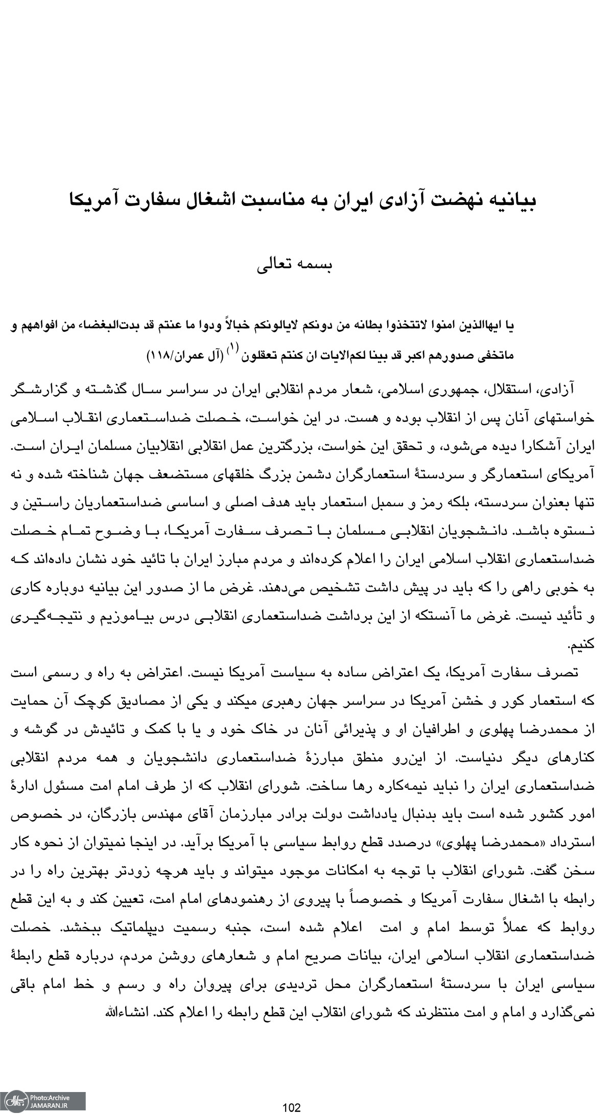 آزادی، استقلال، جمهوری اسلامی، شعار مردم انقلابی ایران در سراسر سال گذشته و گزارشگر خواستهای آنان پس از انقلاب بوده و هست. در این خواست، خصلت ضد استعماری انقلاب اسلامی ایران آشکارا دیده میشود، و تحقق این خواست، بزرگترین عمل انقلابی انقلابیان مسلمان ایران است. آمریکای استعمارگر و سردسته استعمارگران دشمن بزرگ خلقهای مستضعف جهان شناخته شده و نهتنها بهعنوان سردسته، بلکه رمز و سمبل استعمار باید هدف اصلی و اساسی ضد استعماریان راستین و نستوه باشد. دانشجویان انقلابی مسلمان با تصرف سفارت آمریکا، با وضوح تمام خصلت ضد استعماری انقلاب اسلامی ایران را اعلام کردهاند و مردم مبارز ایران با تأیید خود نشان دادهاند که به خوبی راهی را که باید در پیش داشت تشخیص میدهند. غرض ما از صدور این بیانیه دوبارهکاری و تأیید نیست. غرض ما آن است که از این برداشت ضد استعماری انقلابی درس بیاموزیم و نتیجهگیری کنیم.