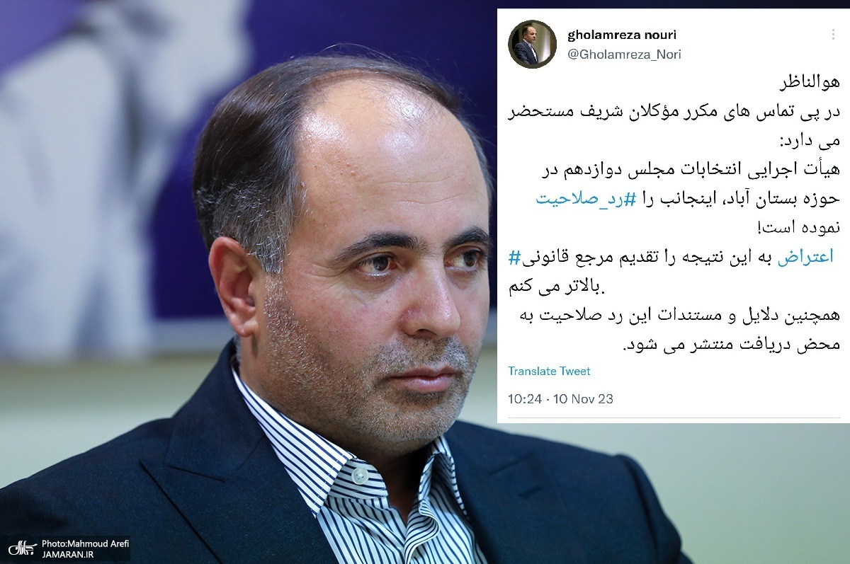 غلامرضا نوری قزلجه، نماینده مردم بستانآباد و رئیس فراکسیون مستقلین مجلس شورای اسلامی از ردصلاحیت خود برای شرکت در انتخابات مجلس دوازدهم خبر داد.