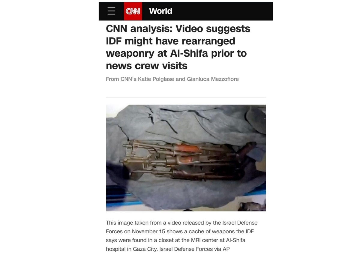 به نوشته ایرنا، شبکه خبری سی ان ان وابسته به حزب دموکرات در آمریکا (حزب جو بایدن رئیس جمهور کنونی آمریکا) که از ابتدای حملات گروههای فلسطینی به اسرائیل در هفتم اکتبر با تهیه گزارش هایی همواره از رژیم اسرائیل و حملاتش با عنوان حق دفاع از خود، حمایت کرده است، روز شنبه به وقت محلی در گزارشی اعلام کرد: ویدئویی که ارتش اسرائیل در ۱۵ نوامبر منتشر کرد، می گوید که تسلیحات متعلق به حماس در کمدی در بخش ام آر آی در بیمارستانی الشفا پیدا شده است. اما تصاویر منتشر شده توسط ارتش اسرائیل در مقایسه با فیلمهای بعدی که توسط گروههای خبری بینالمللی تهیه شده است، سلاح کمتری در محل مذکور را نشان می دهد که نشان دهنده صحنه سازی یا قراردادن سلاح توسط نیروهای اسرائیلی در این منطقه است.