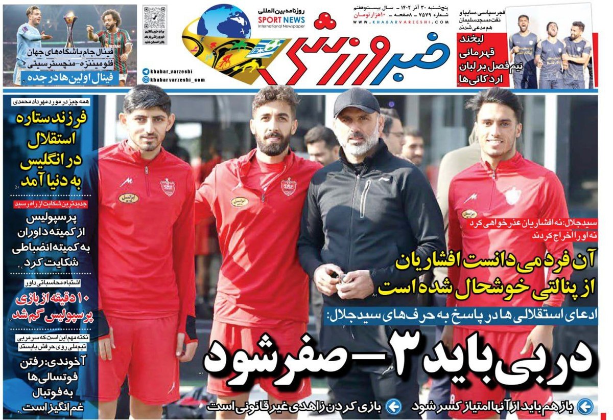 کدخبر: ۱۶۱۷۵۳۶ تاریخ انتشار: ۱۴۰۲/۰۹/۳۰ ۰۱:۳۸:۱۷ روزنامه های ورزشی پنج شنبه ۳۰ آذر ۱۴۰۲ نیم صفحه اول روزنامه های ورزشی پنج شنبه ۳۰ آذر ۱۴۰۲ را در این خبر بخوانید. مشاهده خبر در جماران لینک کوتاه: کلمات کلیدی روزنامه های ورزشی پنج شنبه 30 آذر 1402