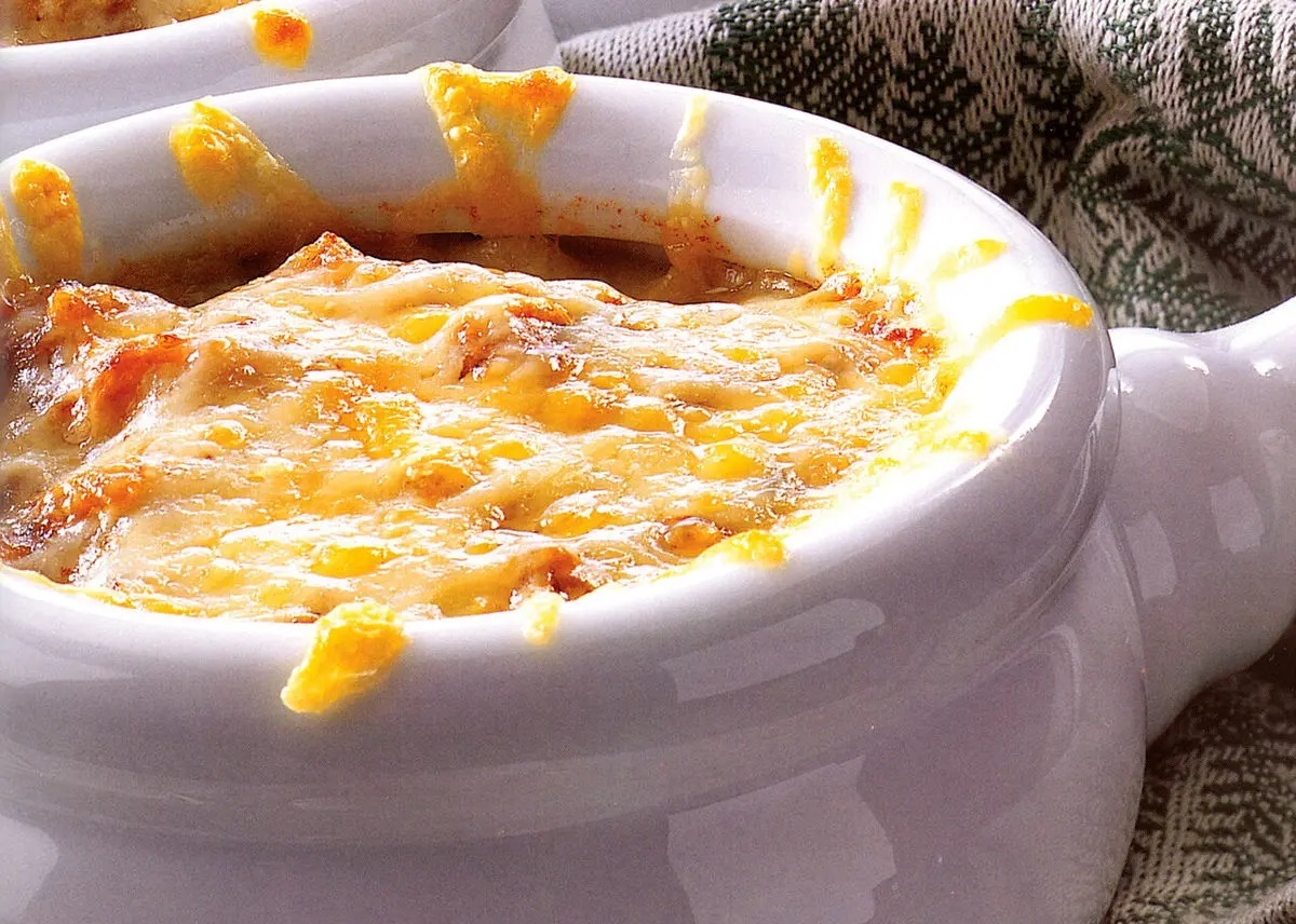 ۴. فرانسویها این سوپ را به صورت تک نفره سرو میکنند. پس به تعداد نفرات، کاسه سرامیکی لعابدار آماده کنید و ابتدا کف هر کاسه یک یا دو عدد نان تست بگذارید و روی آن سوپ بریزید. سپس روی سطح سوپ را هم مقداری پنیر پارمسان یا پنیر گودا بریزید.