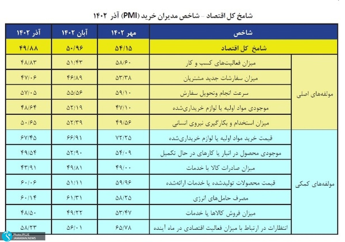 آخرین نظرسنجی گردآوری شده، نشان میدهد که شاخص مدیران خرید برای کل اقتصاد در آذرماه مقدار ۴۹.۸۸ محاسبه شده است که برای سومین ماه پیاپی روند کاهشی داشته است و کمترین مقدار یازده ماه اخیر از بهمنماه (بهغیراز فروردین) را به ثبت رسانده است. در میان مؤلفههای اصلی شاخص میزان سفارشات جدید مشتریان برای دومین ماه بیشترین کاهش را در مقایسه با سایر مؤلفهها داشته است.
