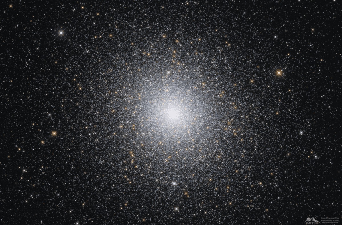 این خوشه متراکم از صدها هزار ستاره در حجمی به وسعت حدود 120 سال نوری تشکیل شده است. در این پرتره تلسکوپی، ستارگان غول قرمز در حومه خوشه، بهراحتی بهعنوان ستارههای زرد رنگ قابل تشخیص هستند.