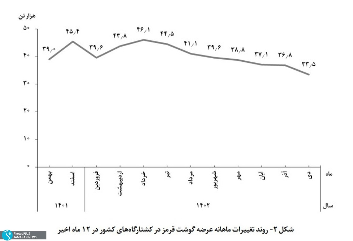 براساس این گزارش، مقدار تولید گوشت در دی ۱۴۰۲، نسبت به ماه مشابه سال ۱۴۰۱ برای گوسفند و بره ۲۹ درصد، برای بز و بزغاله ۱۹ درصد، برای گاو و گوساله ۱۲درصد و برای گاومیش و بچه گاومیش ۱۴ درصد کاهش، و برای شتر و بچه شتر ۹۳ درصد افزایش داشته است.
