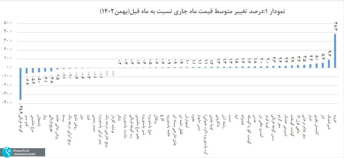 به گزارش جماران، در بهمن ماه ١٤٠٢، از ٥٣ قلم خوراکی منتخب در نقاط شهری، تعداد ٢٠ قلم، درصد تغییر سالانه بالاتر از نرخ تورم نقطهای نقاط شهری کشور ۳۶.۲درصد داشتهاند. بر این اساس، ۳۸درصد کالاها، تورمی بیشتر از تورم سالانه داشته اند.