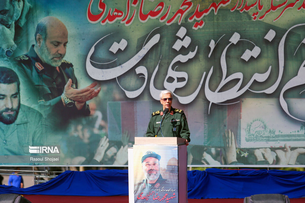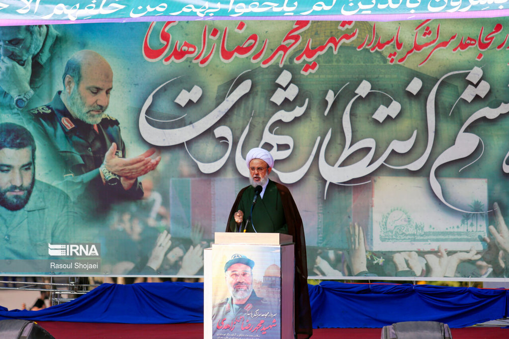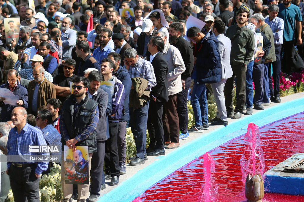رفته رفته مردم روزهدار و همیشه قدردان اصفهان در جای جای میدان بزرگمهر با پر کردند، سرلشگر باقری، رئیس ستاد کل نیروهای مسلح که آشنایی بیش از ۴۰ ساله با سردار شهید محمدرضا زاهدی دارد، در سخنرانی این مراسم از ویژگیهای بارز اخلاقیاش میگوید، از قرآن خواندنش، مهربانی و در عین حال مقتدر بودنش، از تواضعش در حضور در نیروی قدس و از آرزویی که در بهترین شرایط ممکن برایش مقدر شد.