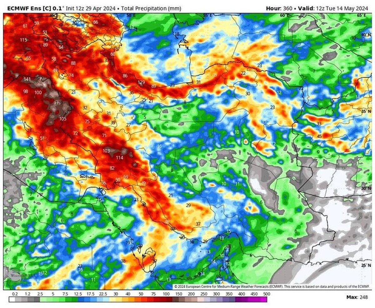 همچنین برای فردا چهارشنبه (۱۲ اردیبهشت) بارش در نیمه جنوبی کشور تشدید میشود و در شمال غرب و غرب رگبار پراکنده رخ خواهد داد. پنجشنبه (۱۳ اردیبهشت) گستره بارش تمام مناطق کشور به جز سیستان و بلوچستان را فرا خواهد گرفت.