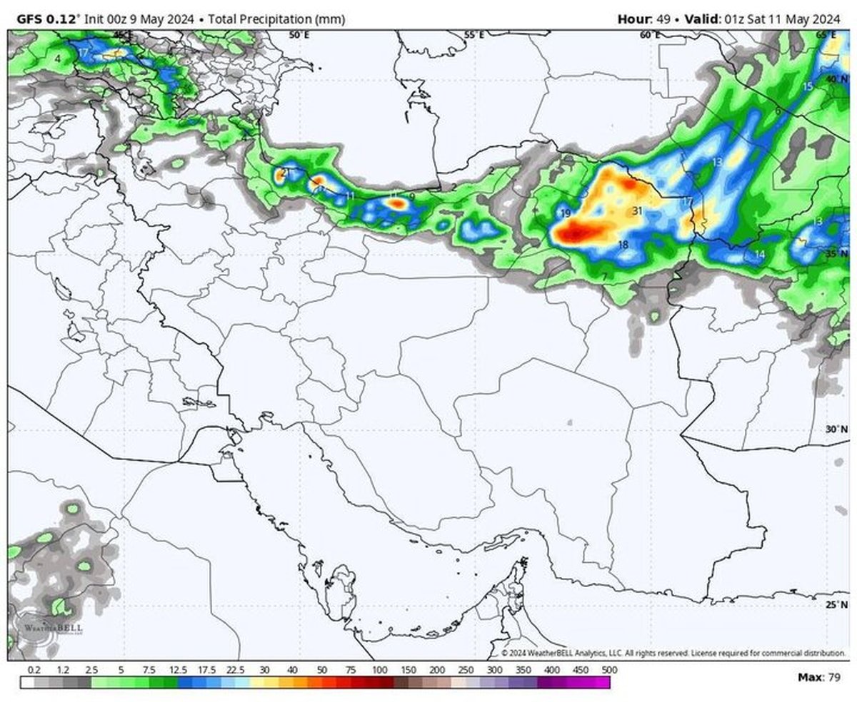 روز دوشنبه (۲۴ اردیبهشت) بارندگی در این نواحی تقویت میشود و علاوه بر این مناطق در چهارمحال و بختیاری و غرب اصفهان نیز بارش رخ میدهد.