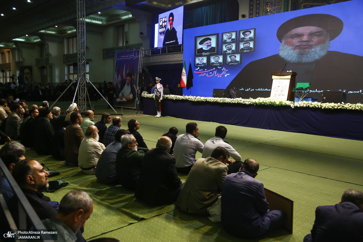 سید حسن نصرالله دبیرکل حزبالله لبنان بعدازظهر امروز (پنجشنبه) در مراسم چهلمین روز شهادت آیتالله رئیسی که در مصلی تهران برگزار شد، در سخنانی اظهار داشت: به مناسبت چهلمین روز حادثه بزرگ و دردناکی که در آن آیتالله سید ابراهیم رئیسی رئیس جمهور اسلامی ایران و همراهان گرامی و بزرگوار ایشان به شهادت رسیدند از طریق صدا و سیمای جمهوری اسلامی ایران با شما صحبت میکنم.