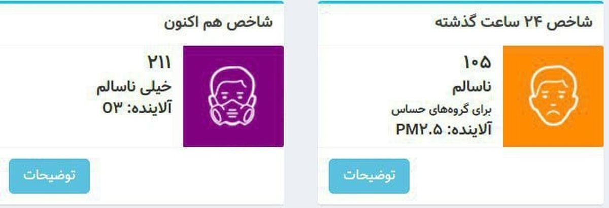بر اساس این گزارش آلاینده شاخص هوای پایتخت طی ۲۴ ساعت گذشته ذرات معلق کمتر از ۲.۵ میکرون با میانگین ۱۰۵ بود و کیفیت هوای پایتخت در وضعیت ناسالم برای گروههای حساس قرار داشت.