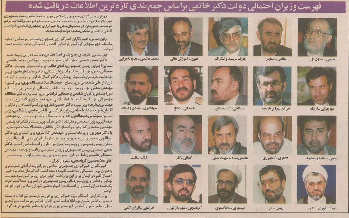کدخبر: ۱۶۳۹۹۳۵ تاریخ انتشار: ۱۴۰۳/۰۵/۲۱ ۰۲:۰۳:۴۴ عکس تاریخی از کابینه دولت خاتمی، ۲۷ سال پیش! چنین شبی! گمانهزنی ترکیب هیئت دولت؛ ۲۷ سال پیش! منبع: مطبوعات قدیمی مشاهده خبر در جماران اخبار مرتبط باهنر: دولت دوم خاتمی بسیار موفق بود/ اگر دولتی بیاید که مثبت های دولت خاتمی را عملیاتی کند باید استقبال کرد/ دولتی ها در مرحله دوم فعالیت سنگینی به نفع جلیلی داشتند/ نه فقط دولت پزشکیان، هرکسی رأی آورده بود آخرین شانس و فرصت بود رحیمی جهان آبادی، نماینده سابق مجلس: دولت پزشکیان نه دولت سوم روحانی است، نه دولت خاتمی/ مردم به اندیشه «تغییر» رای دادند/ انتخاب وزیر از اندیشه رقیب اشتباه است/ از نیروهای قدیمی اصلاح طلب باید در اتاق فکر استفاده شود جلیل محبی: دولت رئیسی برای فرار از مسئولیت گشت ارشاد، آن را به گردن دولت خاتمی انداخت یک فعال کارگری: جمعیت زیر خط فقر مطلق به 35 درصد رسیده! این رقم در دولت خاتمی 15 ، در دولت احمدینژاد به 20 و در دولت روحانی 25 درصد بود لینک کوتاه: کلمات کلیدی سید محمد خاتمی دولت خاتمی