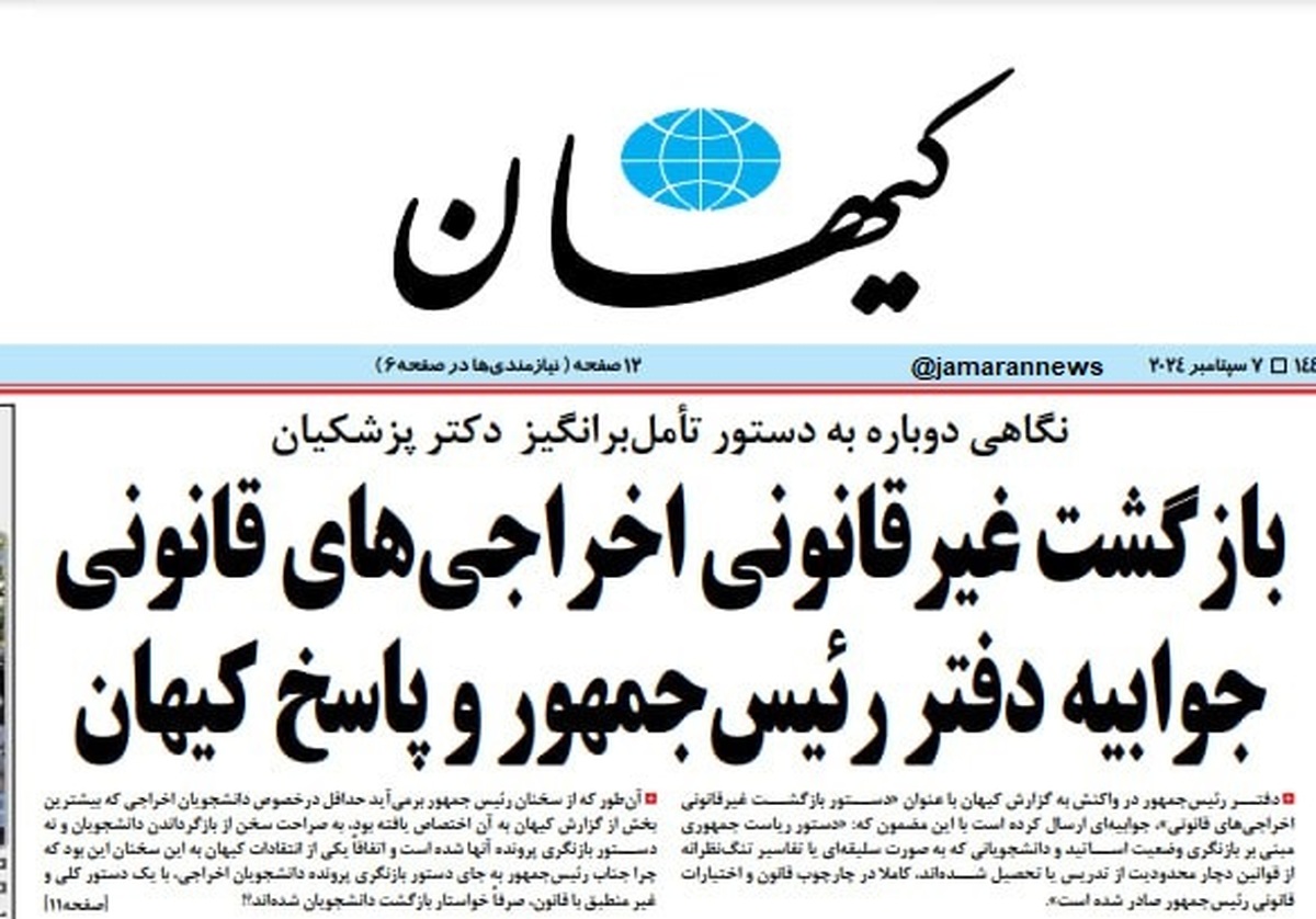 احتراماً پیرو درج مطلبی با عنوان «بازگشت غیرقانونی اخراجیهای قانونی آقای پزشکیان! با کدام توجیه؟» در تیتر اول آن روزنامه در تاریخ ۱۰ شهریور ۱۴۰۳ که حاوی برخی ادعاهای نادرست و تفسیر ناصواب از اظهارات ریاست محترم جمهوری در یکی از سخنرانیهای اخیر میباشد، نکات زیر بهعنوان جوابیه ایفاد میشود و لازم است برابر ماده ۲۳ قانون مطبوعات با رعایت دقیق ضوابط معین شده در قانون مورد نظر، در شماره روز شنبه ۱۷ شهریور ۱۴۰۳ منتشر شود.