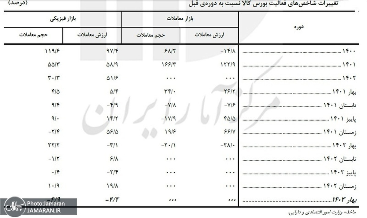 بر اساس این گزارش، در پایان فصل بهار ۱۴۰۳ در بورس کالای ایران ارزش معاملات در بازار فیزیکی با ۴.۲ درصد کاهش نسبت به فصل قبل به ۴۱۸۹۲۴۲ میلیارد ریال رسیده است.