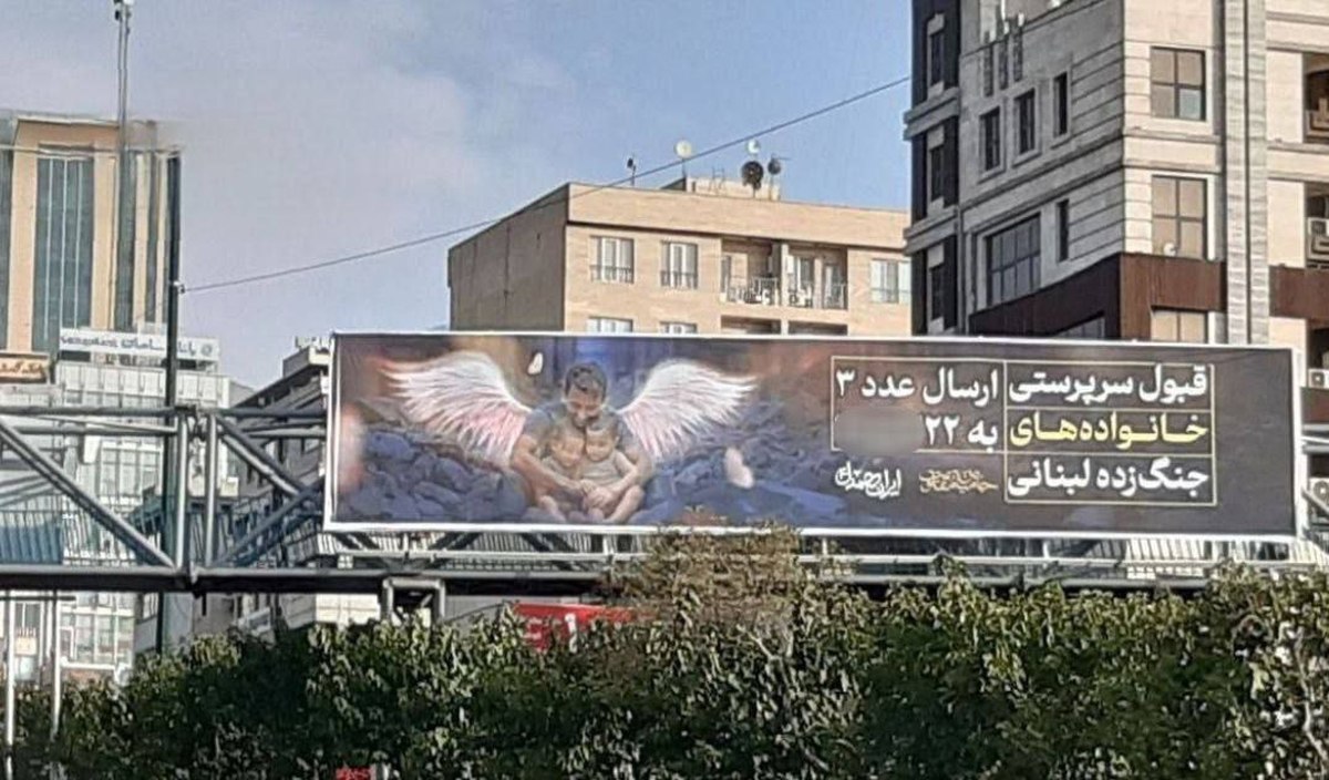 روی این بنر در تهران به مردم پیشنهاد شده که با ارسال پیامک به یک شماره از خانوادههای جنگزده لبنانی حمایت کنند و سرپرستی آنها را برعهده گیرند.