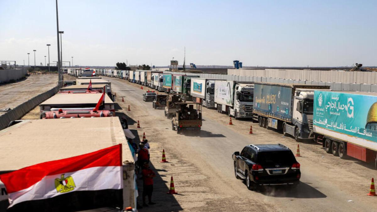 کامیون های کمکهای بشر دوستانه در بخش مصری گذرگاه رفح صف کشیدهاند و حامل تنها مواد غذایی و کمکهای امدادی آماده برای ورود به نوار غزه هستند.