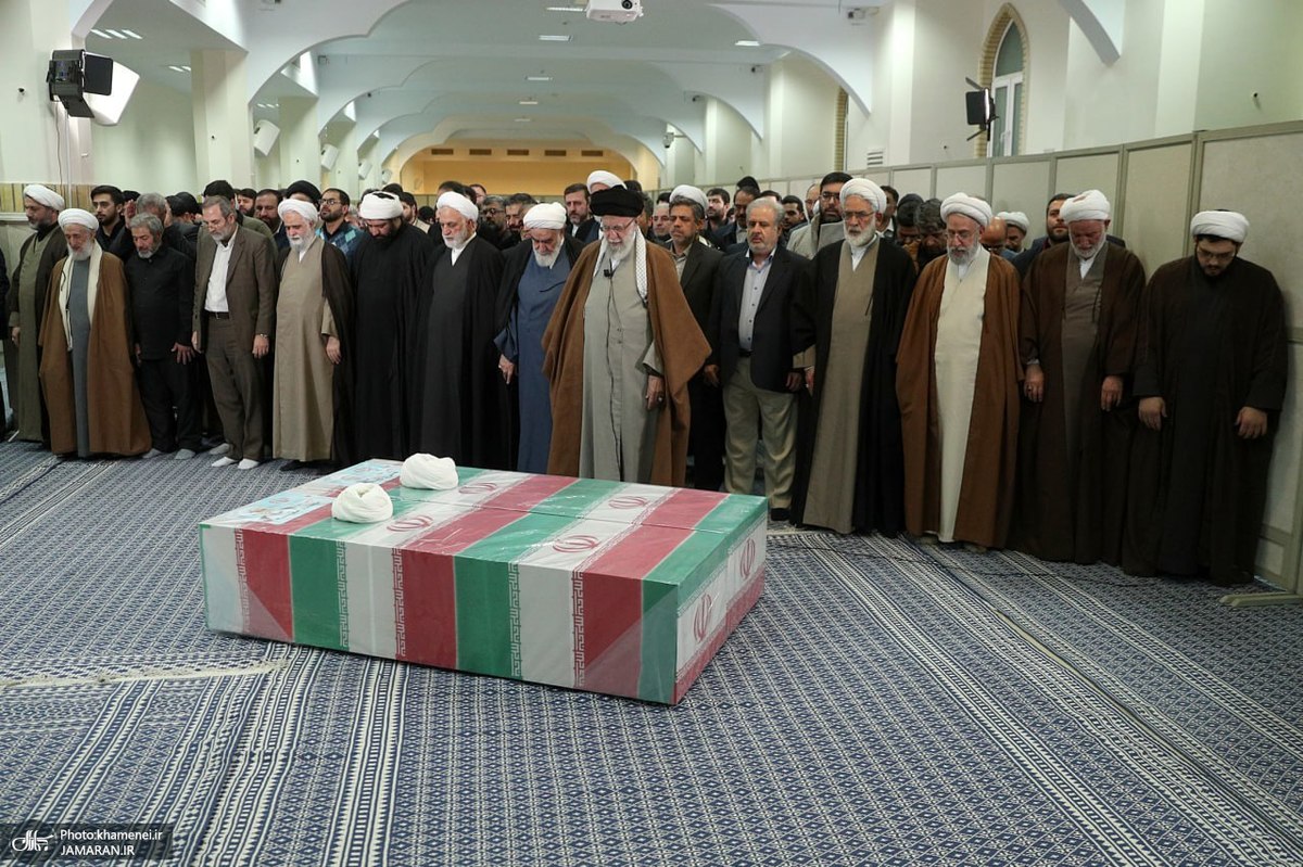 حضرت آیتالله خامنهای رهبر معظم انقلاب اسلامی بر پیکر دو قاضی شهید حجج اسلام آقایان شیخ علی رازینی و شیخ محمد مقیسه اقامه نماز کردند.