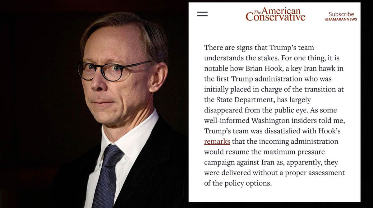 به گزارش جماران؛ مجله امریکن کانسرواتیو مدعی شد که دلیل برکناری برایان هوک این بوده که قبل از اینکه سیاست دولت ترامپ در قبال ایران تعیین شود، اعلام کرده که سیاست دولت دوم او سیاست فشار حداکثری خواهد بود.