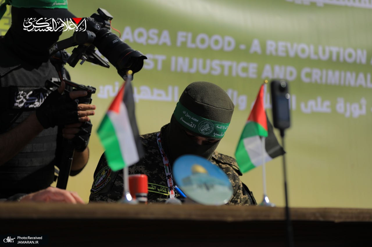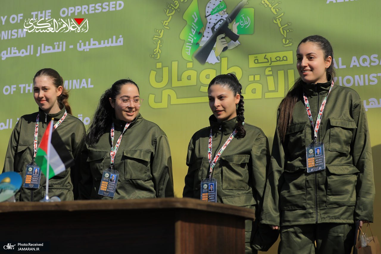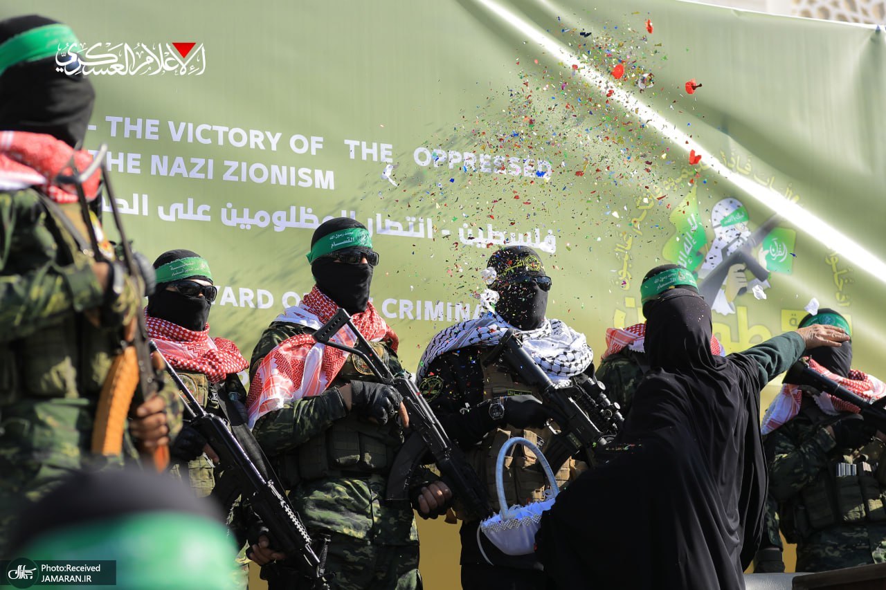 4 نفر از مبارزان گردانهای قسام که روی صحنه کنار چهار نظامی زن اسیر اسرائیلی ایستادهاند، سلاح تافور که ویژه نیروهای نخبه ارتش رژیم صهیونیستی است، در دست دارند. این صحنه یک تحقیر بزرگ برای ارتش اشغالگر صهیونیستی است.
