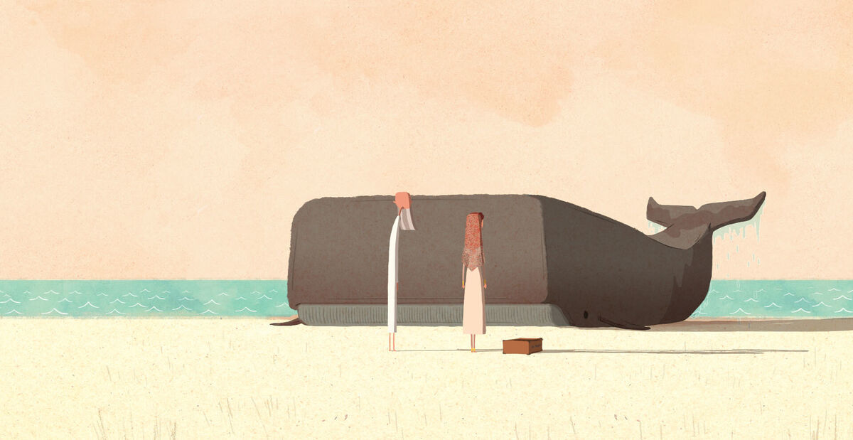 پدر هم، با وجود آسیبهای روانی بجا مانده از جنگ، روحش برای دختر پر میکشد. آنگاه که دختر عزم سفر دارد روح او در تصویرسازی خلاقانهای به دختر میگوید «دورت بگردم». آنگاه که تلاشها برای حل مسئله و نجات نهنگ به نتیجه نمیرسد، باز با فداکاری پدر است که مشکل حل میشود.