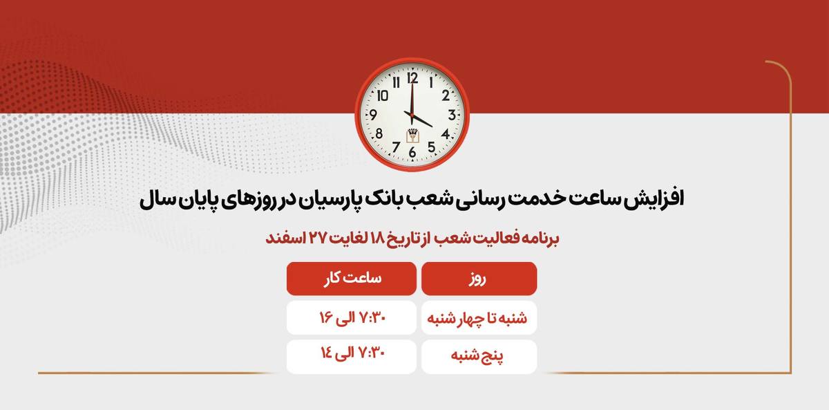 تمامی شعب بانک پارسیان در تهران و سایر استانها از روز شنبه ۱۸ اسفندماه لغایت روز دوشنبه ۲۷ اسفندماه روزهای شنبه الی چهارشنبه تا ساعت ۱۶ و روزهای پنجشنبه تا ساعت ۱۴ آماده پاسخگویی و ارائه خدمات به مشتریان هستند.