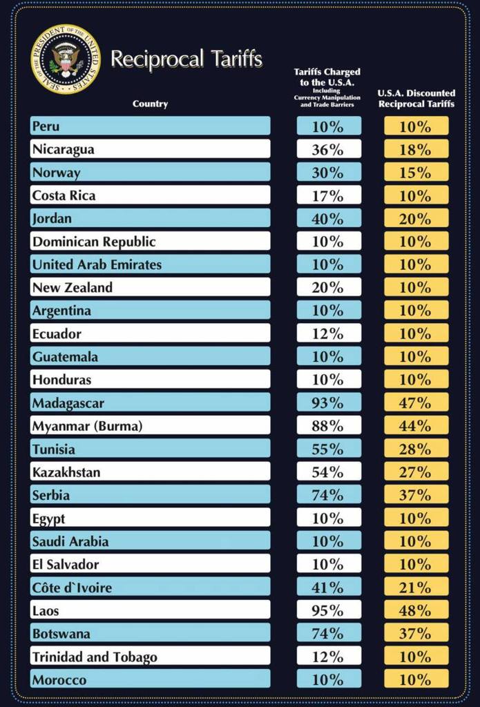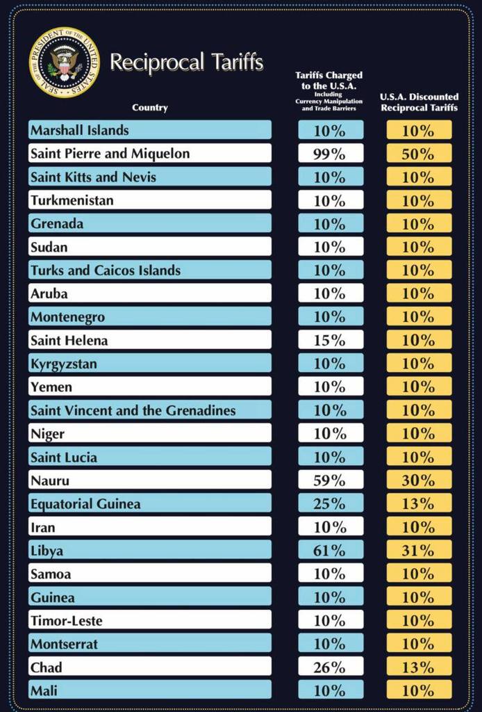 این جدول مربوط به «تعرفههای متقابل» (Reciprocal Tariffs) است و میزان تعرفههایی را که کشورهای مختلف بر کالاهای وارداتی از ایالات متحده اعمال میکنند، در مقایسه با تعرفههایی که آمریکا بر کالاهای آن کشورها اعمال میکند، نشان میدهد.