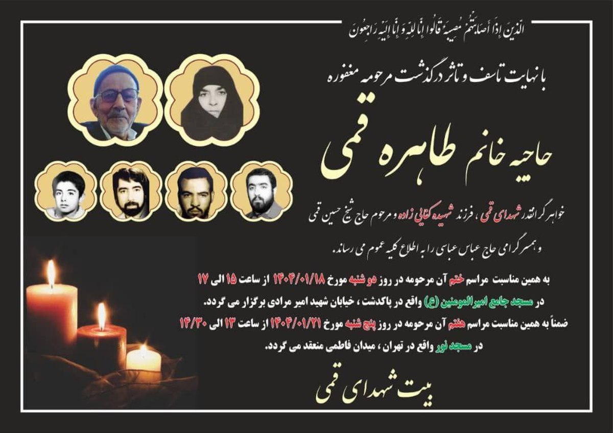مراسم ختم مرحومه حاجیه خانم طاهره قمی امروز برگزار می شود.