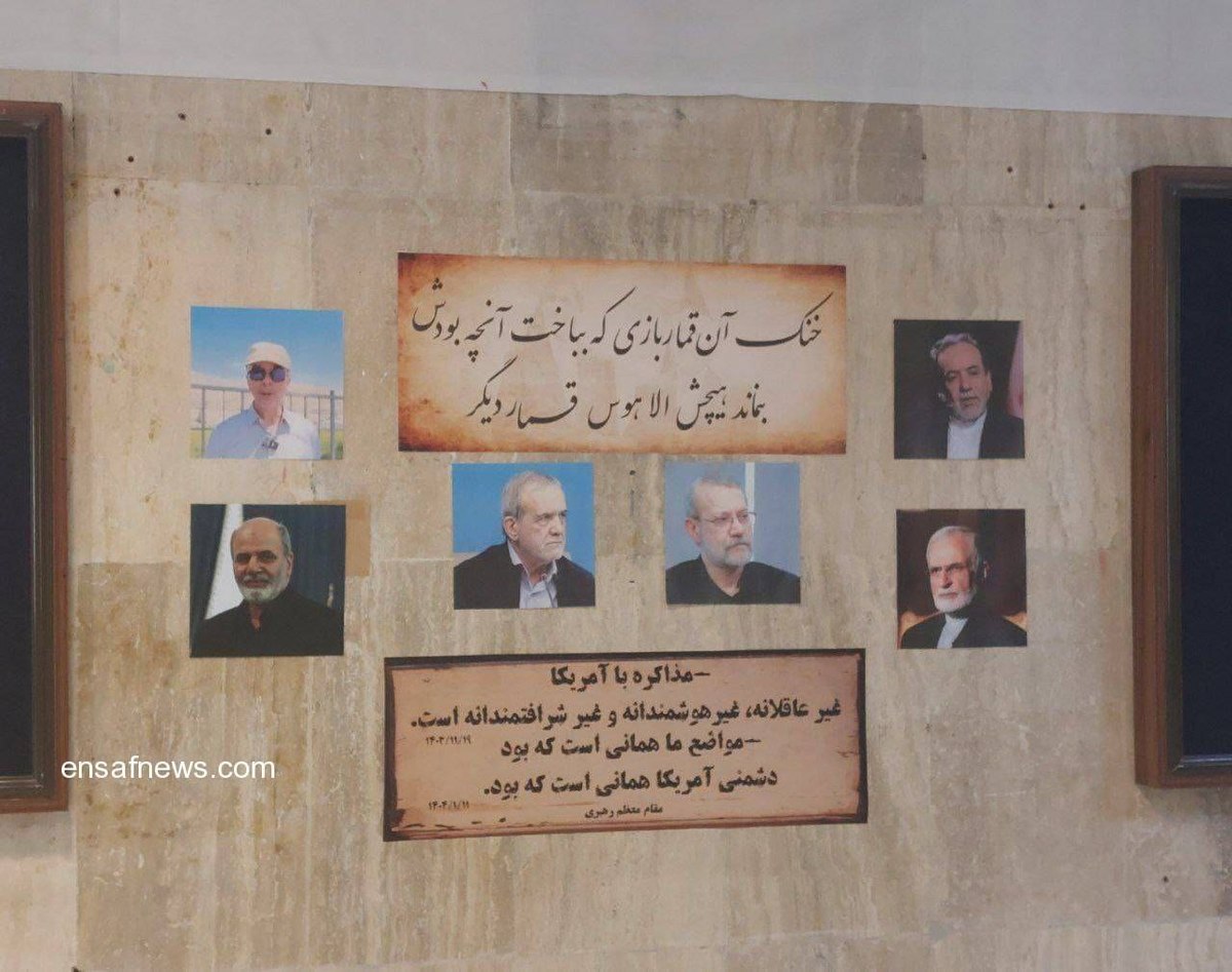 در کنار این عکسها سخنانی از رهبری دربارهی موضوع مذاکره ایران و آمریکا نیز دیده میشود به همراه این بیت شعر: خنک آن قماربازی که بباخت هرچه بودش / بنماند هیچش الا هوس قمار دیگر.