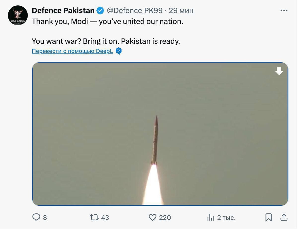 صفحه منتسب به وزارت دفاع پاکستان اعلام کرد: «متشکریم مودی، شما ملت ما را متحد کردید. آیا جنگ می خواهید؟ بیایید شروع کنیم. پاکستان آماده است.»