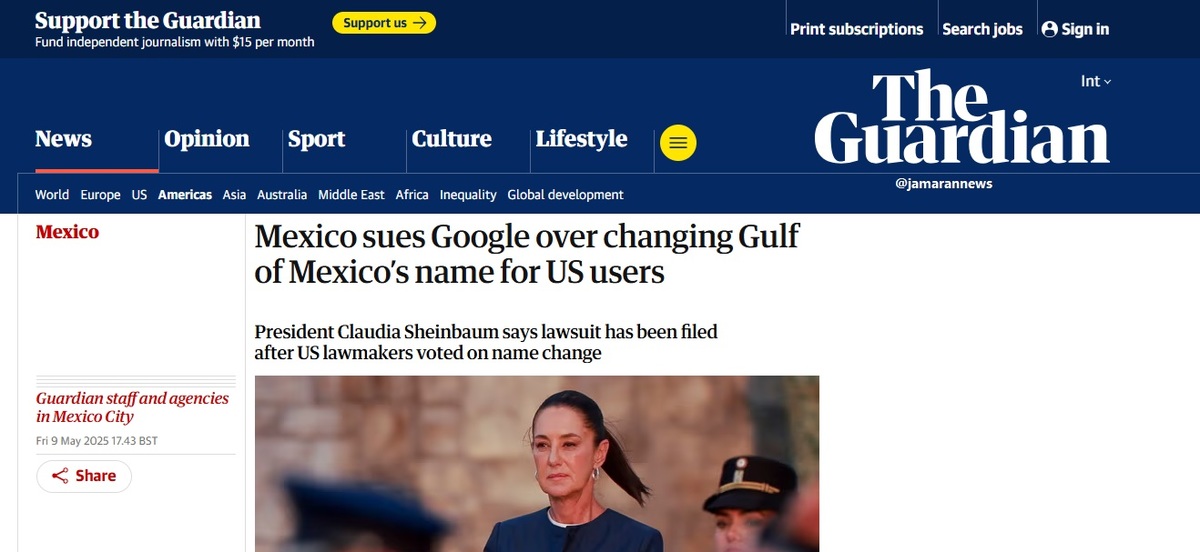 دولت مکزیک از شرکت گوگل به دلیل درج نام خلیج آمریکا به جای خلیج مکزیک شکایت می کند.