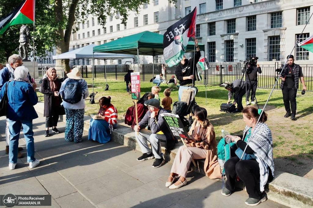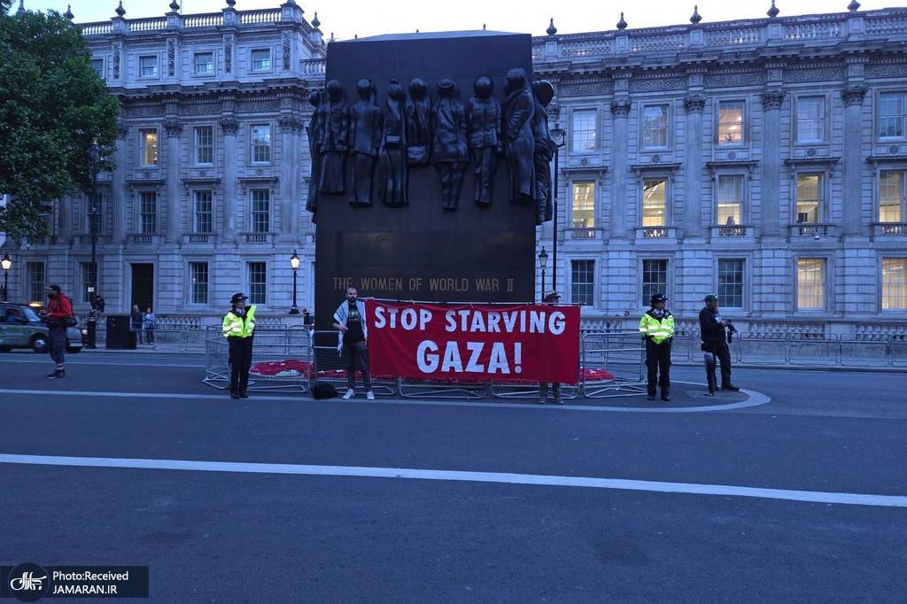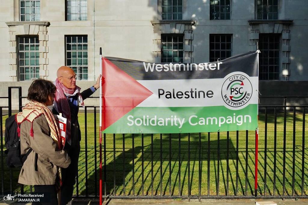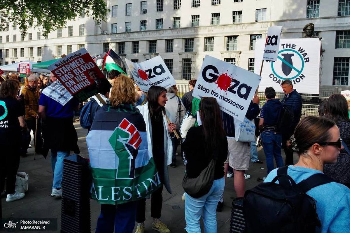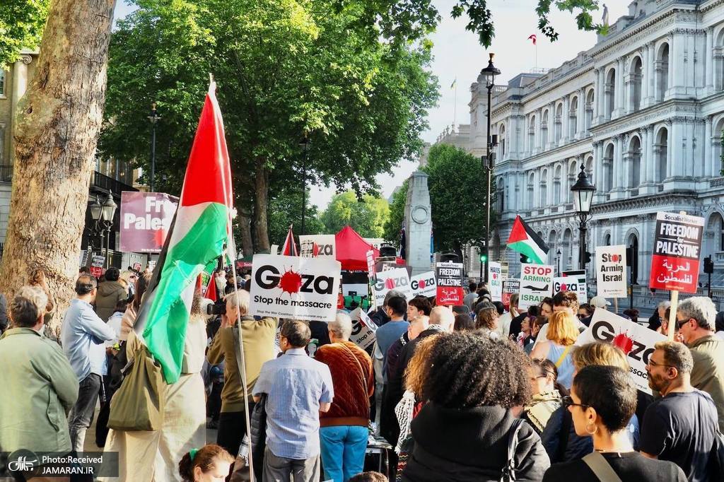 صدها نفر در داونینگ استریت لندن در همبستگی با فلسطینیان راهپیمایی کردند و خواستار پایان فوری تجارت اسلحه با اسرائیل شدند.