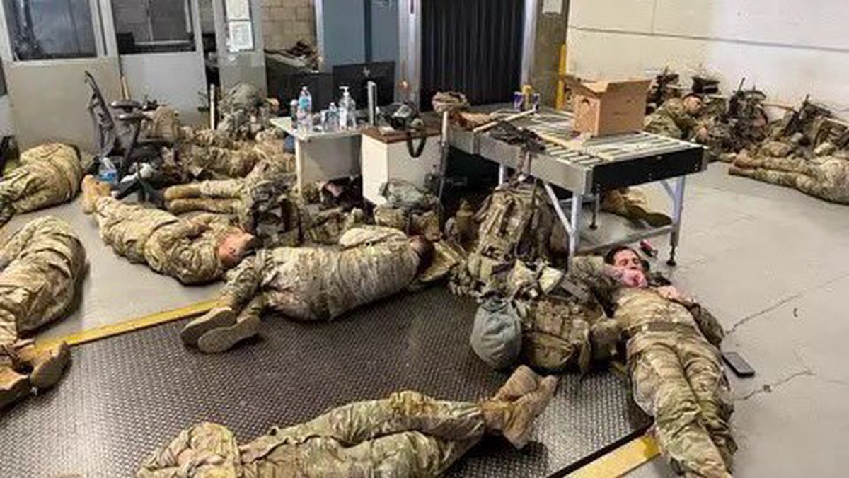 او همچنین دو عکس منتشر کرد که اعضای گارد ملی را نشان میدهد که روی زمین، ظاهراً در داخل یک ساختمان دولتی، دراز کشیدهاند. او در پست دیگری نوشت: «این نحوه برخورد دونالد ترامپ با سربازانش است. شرمآور است.»