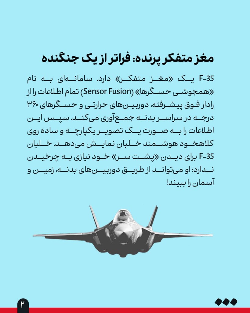 در عصر نبردهای ترکیبی، جنگندهها دیگر فقط ابزار درگیری مستقیم نیستند، بلکه بخشی از یک معماری بزرگتر برای مدیریت میدان نبرد محسوب میشوند. F-35، دقیقاً به همین دلیل، در رأس این تحول قرار دارد. طراحی آیندهنگرانهاش، قابلیت سازگاری با انواع مأموریتها، و پیوندش با سیاست خارجی آمریکا، آن را به فراتر از یک جنگنده تبدیل کرده: یک نماد برتری تکنولوژیک، شبکهمحور و سیاسی در جهان پرتنش امروز.