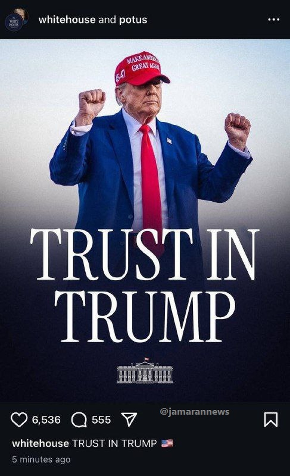 صفحه رسمی کاخ سفید با انتشار این تصویر نوشت: «به ترامپ اعتماد کنید»!