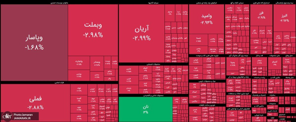 شاخص کل بورس با افت سنگین ۶۲ هزار و ۵۴۸ واحدی (معادل ۲.۱ درصد) به سطح ۲ میلیون و ۹۲۲ هزار واحد عقبنشینی کرد. شاخص هم وزن نیز با کاهش ۱۵ هزار و ۵۹۲ واحدی (معادل ۱.۷ درصد) به سطح ۹۰۸ هزار واحد رسید. در بازار فرابورس نیز شاخص کل با افت ۴۶۴ واحدی به رقم ۲۶ هزار و ۷۴۰ واحد رسید. نمادهای "فارس"، "فملی"، "فولاد"، "وبملت"، "پارسان"، "شستا" و "نوری" بیشترین اثر منفی را بر شاخص کل بورس گذاشتند و در فرابورس نیز "آریا"، "نیشکر"، "ومپنا"، "آریان"، "سامان"، "وسپهر" و "مارون" در افت شاخص نقشآفرین بودند.