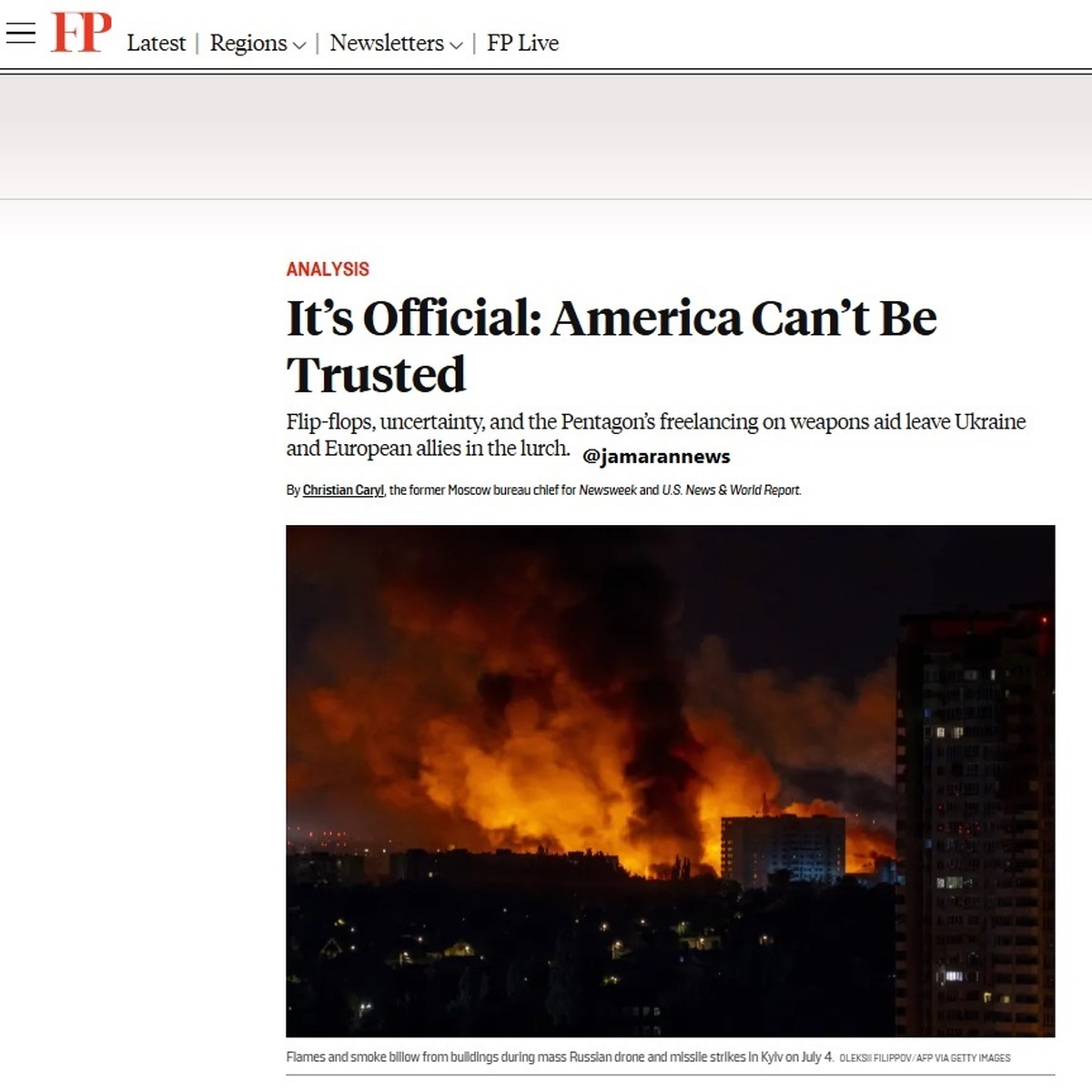 فارن پالیسی با اشاره به بدقولی دولت ترامپ نسبت به اوکراین و کاهش کمک ها به این کشور در جنگ با روسیه نوشت: حالا رسمی شده: نمیتوان به آمریکا اعتماد کرد.