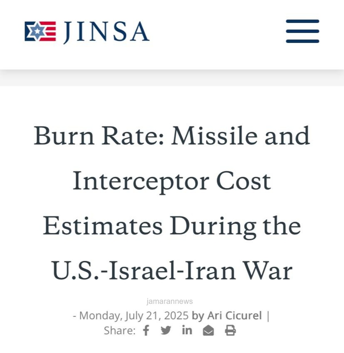 در گزارشی تحلیلی، مؤسسه یهودی امنیت ملی آمریکا (JINSA) هشدار داده است که ایالات متحده در جریان جنگ اخیر با ایران، نزدیک به ۱۴ درصد از ذخایر موشکهای رهگیر خود را مصرف کرده و بازسازی آن ممکن است تا هشت سال به طول انجامد. این گزارش ضمن تأکید بر کاهش سریع ذخایر سامانههای دفاعی پیشرفته نظیر تاد (THAAD)، از افزایش نرخ اصابت موشکهای ایرانی در دورههایی که سامانههای آمریکایی تحت فشار بودهاند، بهعنوان نشانهای از آسیبپذیری جدی در برابر حملات آینده یاد کرده است.