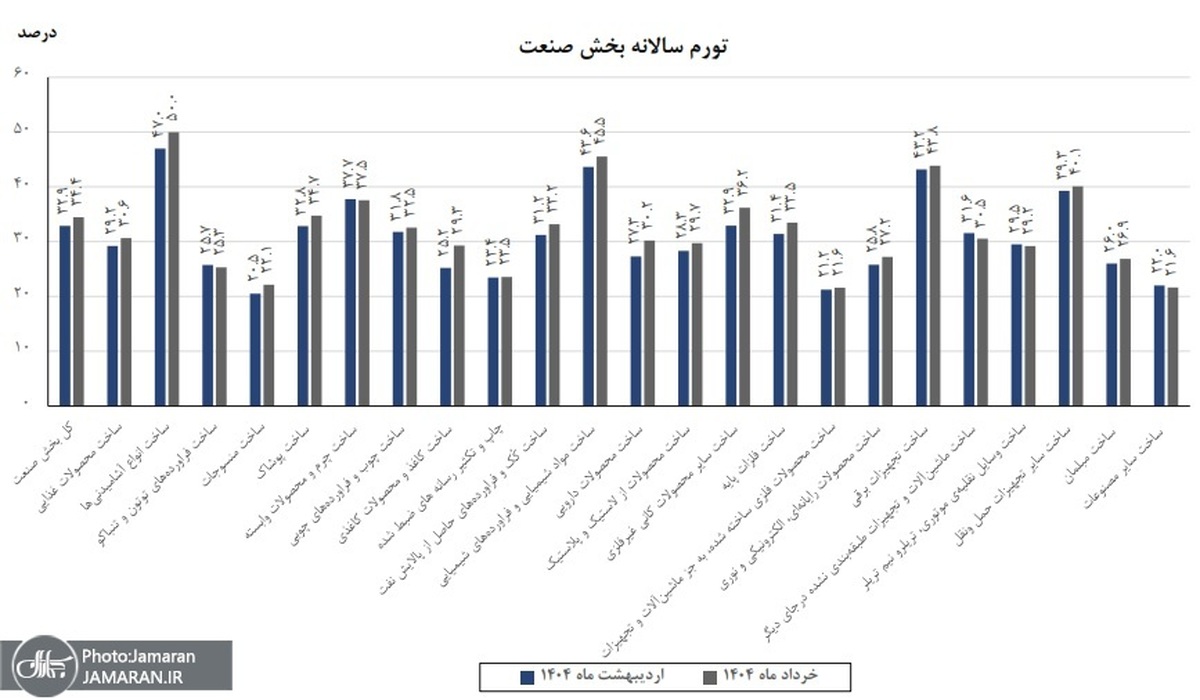 در مقایسه با خرداد سال گذشته، قیمت تولیدات صنعتی ۴۴.۴ درصد بیشتر شده و تورم نقطهای صنعت با وجود کاهش جزئی، همچنان بالاست. همچنین تورم سالانه در این بخش به ۳۴.۴ درصد رسیده که نسبت به اردیبهشت (۳۲.۹ درصد) ۱.۵ واحد درصد افزایش یافته است. در این میان، محصولات غذایی رکورددار گرانی ماهانه و نوشیدنیها با ۷۴ درصد رشد سالانه، پیشتاز گرانی در یک سال گذشته بودهاند.