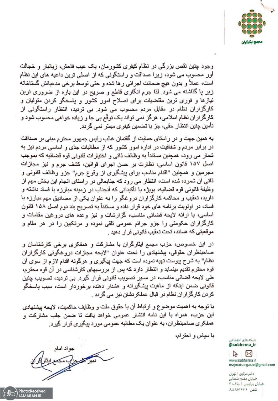 پیشنهاد مجمع ایثارگران به رییس جمهور و رییس قوه قضاییه: باب پالایش گفتار کارگزاران نظام گشوده شود