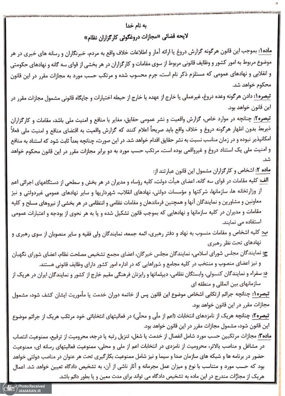 پیشنهاد مجمع ایثارگران لایحه «مجازات دروغگویی کارگزاران نظام» است؛ که کلیات آن پیشتر (۱۴۰۳) تقدیم و منتشر شده است.