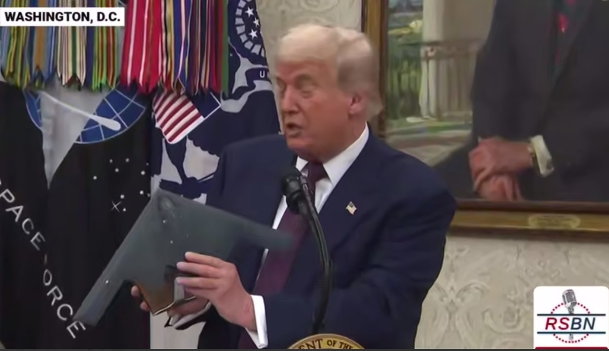 به گزارش جماران؛ ترامپ ماکتی از بمب افکن بی-۲ را در مقابل دوربین خبرنگاران به نمایش گذاشت