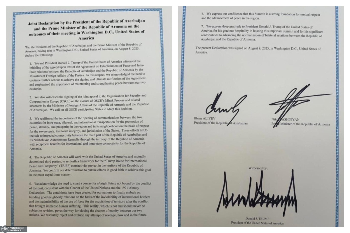 ما و دونالد جی. ترامپ، رئیسجمهور ایالات متحده آمریکا، شاهد پاراف «متن توافقنامهی مورد توافق در زمینه برقراری صلح و روابط بیندولتی بین جمهوری آذربایجان و جمهوری ارمنستان» توسط وزیران امورخارجه طرفین بودیم. دراین خصوص، ما بر نیاز به ادامه اقدامات بیشتر برای دستیابی به امضا و تصویب نهایی این توافقنامه اذعان کردیم و بر اهمیت حفظ و تقویت صلح بین دو کشور تأکید نمودیم.