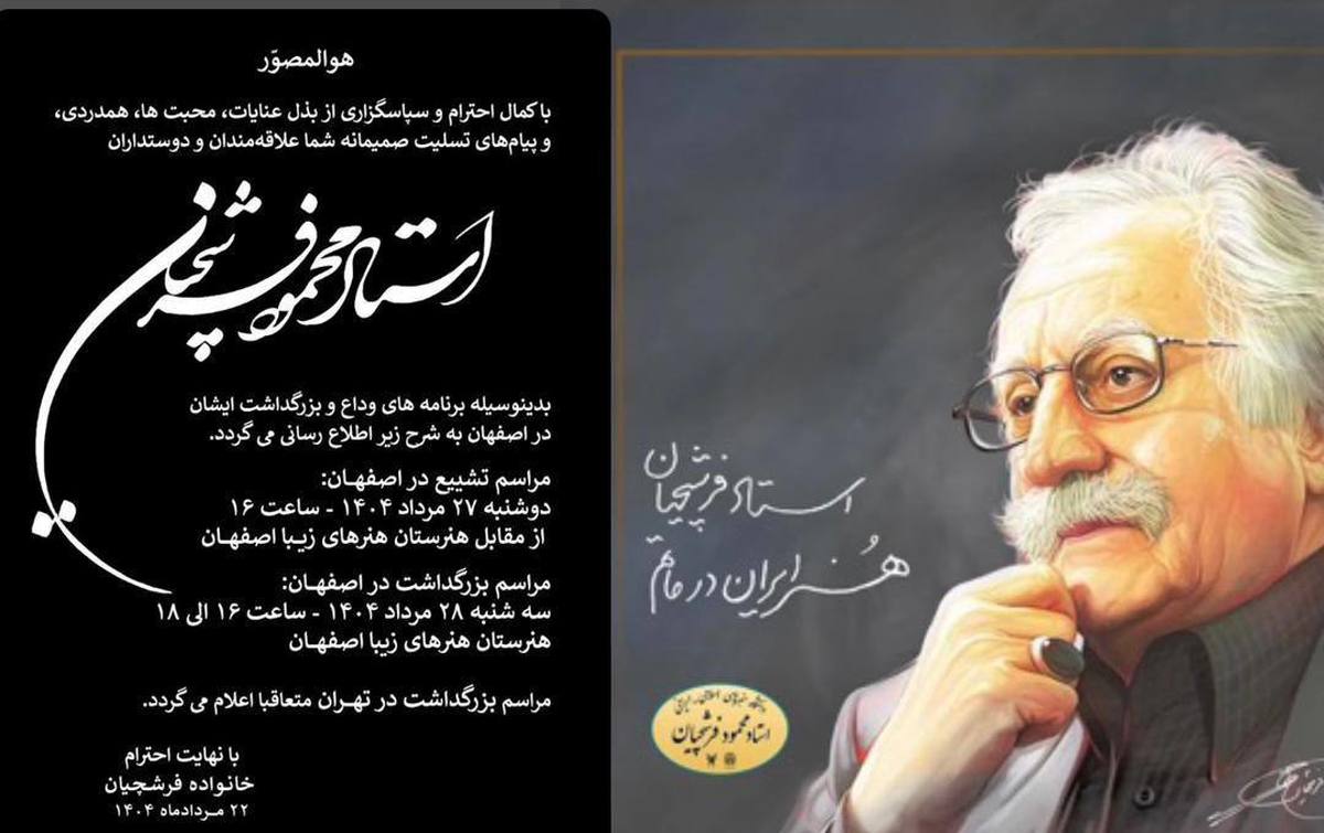 پیکر استاد محمود فرشچیان پس از ورود به ایران عزیز، روز دوشنبه ۲۷ مردادماه، ساعت ۱۶ در اصفهان تشییع میشود.