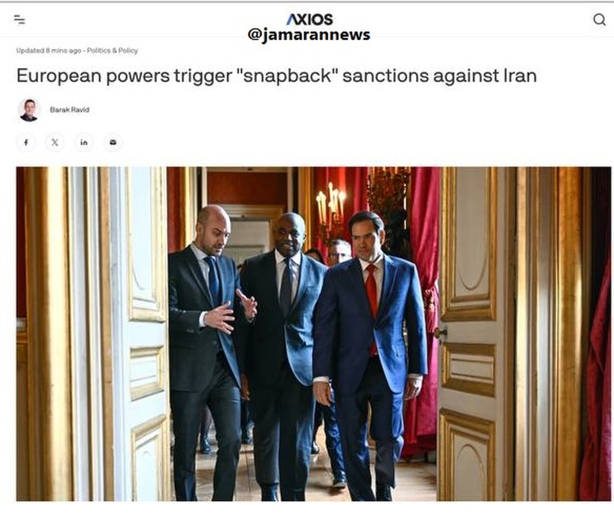 • روز چهارشنبه، وزرای خارجه فرانسه، آلمان، بریتانیا و مسئول سیاست خارجی اتحادیه اروپا در تماس با وزیر خارجه آمریکا، مارکو روبیو، گفتهاند که پنجشنبه مکانیسم ماشه را فعال خواهند کرد. این موضوع را سه منبع آگاه به آکسیوس تأیید کردهاند.